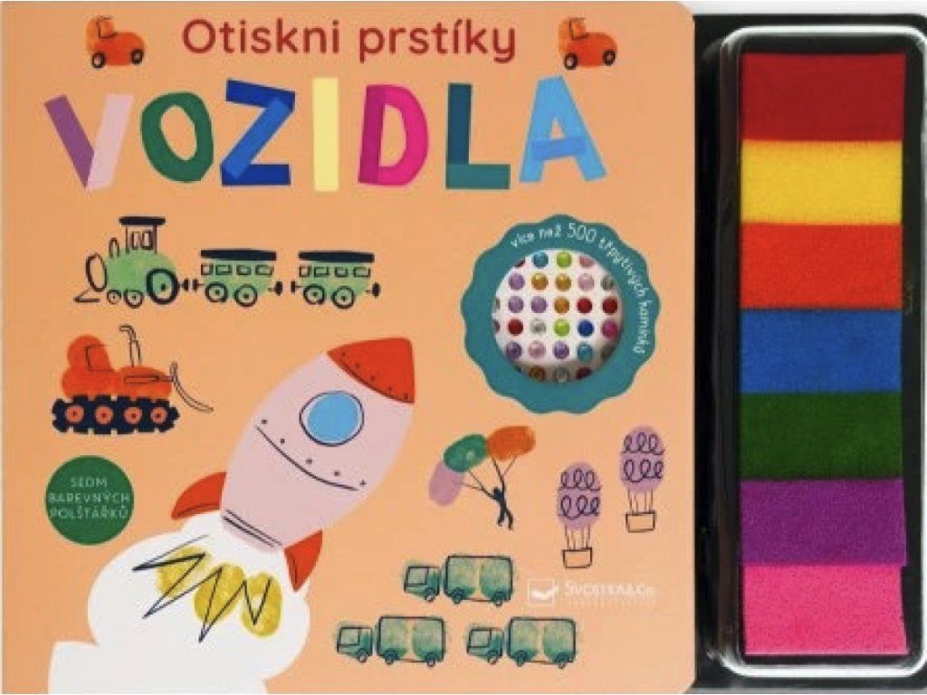 Tato kreativní kniha obsahuje spoustu nápadů a návodů na vytvoření zábavných obrázků pomocí barevných otisků prstíků. Na každé stránce s nejrůznějšími dopravními prostředky mohou děti dotvořit scénu podle své fantazie - natisknout na koleje vlakovou soupravu, na silnice spoustu aut, na nebe horkovzdušné balony nebo na závodiště rychlé formule. Hotové otisky pak děti doladí fixem a drobnými detaily z více než 500 třpytivých kamínků. Různé prsty vytvářejí různé otisky, takže děti přirozeně trénují jemnou motoriku, koordinaci oko-ruka i tvořivost.